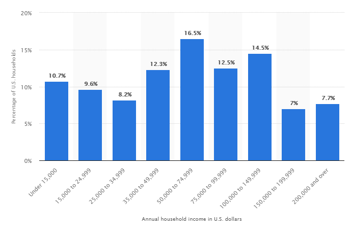 Lets use the same incomes as in the progressive model. For some one who is single making $50000 a year with a $12200 standard deduction means a taxable income of $37800 a year. So taxed at 10%, the math would be much simpler to just ($37800)(10%) = $3780 for a effective tax of ($3780/$50000)(100) = 7.56%. For someone earning a $100000 year, I am going to skip through the math here and it means an a total taxed amount of $8780 and an effective tax rate of 8.78%. So for lower to average American earners this reduces their tax burden slightly about 1.08% at 50k a year but at higher earners it significantly reduces their tax burden by almost half. So this tax system definitely benefit higher earners more, its not unfair exactly either since it even reduces the tax burden of lower earners as well slightly. Even if we look at someone making like $25000 range lets run the numbers on how the flat tax versus progressive effects them. So at $25000 minus the $12200 deduction with the flat tax model that is a taxable income of $12800 at 10% is $1280 income tax, and a effective tax rate of $1280/$25000 = 5.12%. With the progressive model its $969.9 + $372.12 = $1342.02 for effective tax of $1342.02/$25000 = 5.36%. So looking at it this want you might be thinking, “Why aren’t we doing a flat tax? It seems better for everyone.” Everyone benefits to some degree and is objectively more fair, however, something that must be considered is the amount of revenue the Federal government would lose out on. So in this very specific example of a flat tax it is objectively more fair then progressive, however if the amount of revenue collected by the government has to be match in the flat tax model then the story changes drastically. A flat tax that gets up to 15% or higher would start to be come a regressive tax model and starts to become extremely unfair to low earners, and even relatively high earners as well. So with someone earning $50K at 15% flat tax that’s an effective tax rate of 11.34%, you would have to make at least 85K a year to effectively begin to be taxed less overall then in the progressive model. At 85k a year at 15% flat tax that’s an effective tax of 12.85% and with the progressive its about 13.03%. The majority of Americans do not make 85K a year according to Figure 2 below.